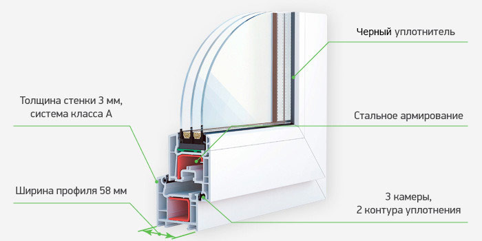 VEKA EUROLINE – это 3-камерная система с монтажной глубиной профиля 58 мм и 2-мя контурами уплотнения. Три камеры профиля обеспечивают надежную теплоизоляцию. Два контура высокоэффективного эластичного уплотнения чёрного цвета надежно защищают от пыли, влаги и обеспечивают высокую герметичность, надежный контакт и плотное прилегание рамы к створке.